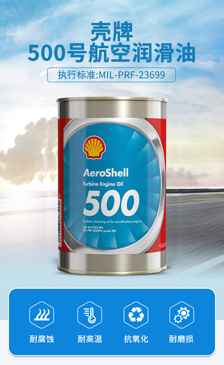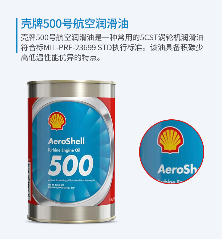 AeroShell Turbine Oil 500是一種常用的5cSt渦輪機潤滑油,符合標MIL-PRF-23699 STD執(zhí)行標準。該油具備積碳少、高低溫性能較好的特點。殼牌500航空潤滑油在軍、民航空領域均有著廣泛的應用。