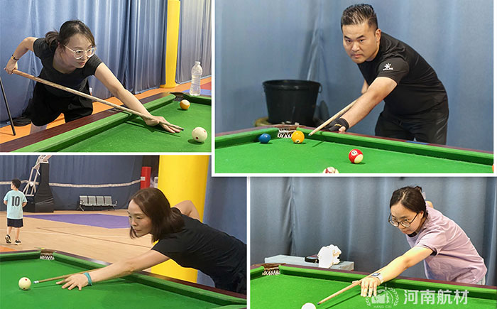 臺(tái)球桌成為他們的競技場,袁總一襲黑衣修身勾勒沉穩(wěn)氣場,俯身架桿似磐石,視線銳利穿透彩球軌跡。球桿疾推白球沖出,這是策略與技術(shù)的完美結(jié)合!場邊的伙伴或靜觀沉思,或躍躍欲試,沉穩(wěn)之中見鋒芒,正是航材人工作中的細(xì)致底色。